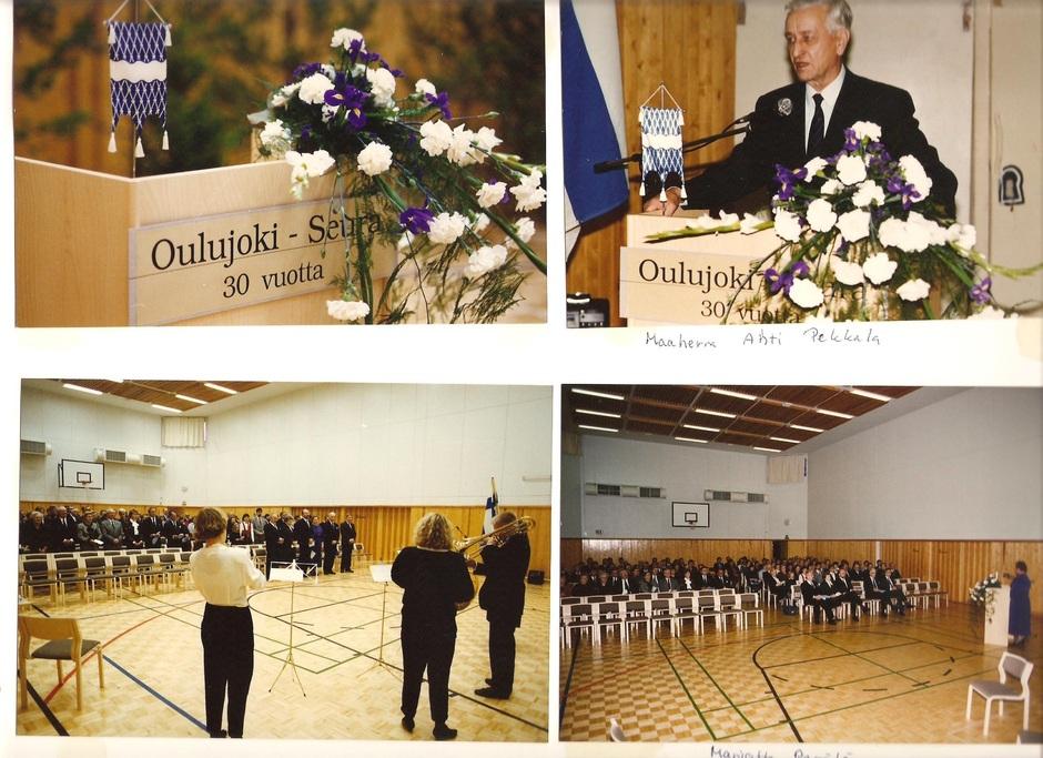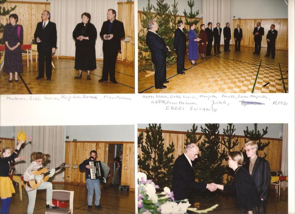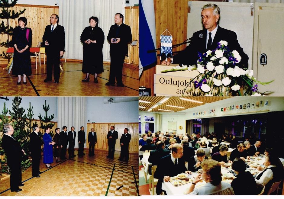 Metsäoppilaitoksella 30-vuotisjuhlassa juhlapuheen piti maaherra Ahti Pekkala. Juhlavastaanotolla olivat vieraita vastaanottamassa ylemmässä kuvassa kirkkoherra Paavo Moilanen, Maisa Nurmiala, Eeva-Liisa Mustonen. Toisessa kuvassa kaupungin tervehdyksen toivat Matti Rossi ja Erkki Suvanto, vastaanottamassa yhdistyksemme perustajajäsen Matti Vasala, puheenjohtaja Marjatta Perälä, kirkkoherra Paavo Moilanen, johtokunnan jäsen Heikki Jaakkola. Alhaalla oikealla olevassa kuvassa on juhlaväkeä aterialla mm. Anna-Liisa Turkka, Eeva Turkka, Laura Tervaoja, Rainer Bastman, Pirjo Bastman, Martta Turkka.