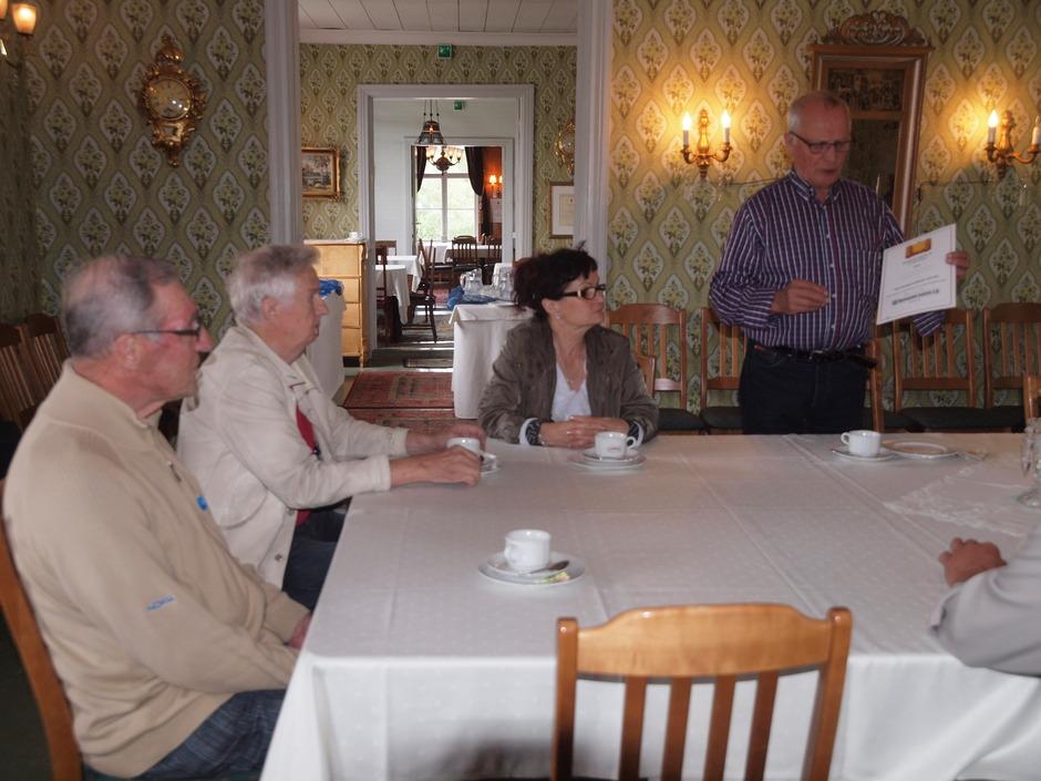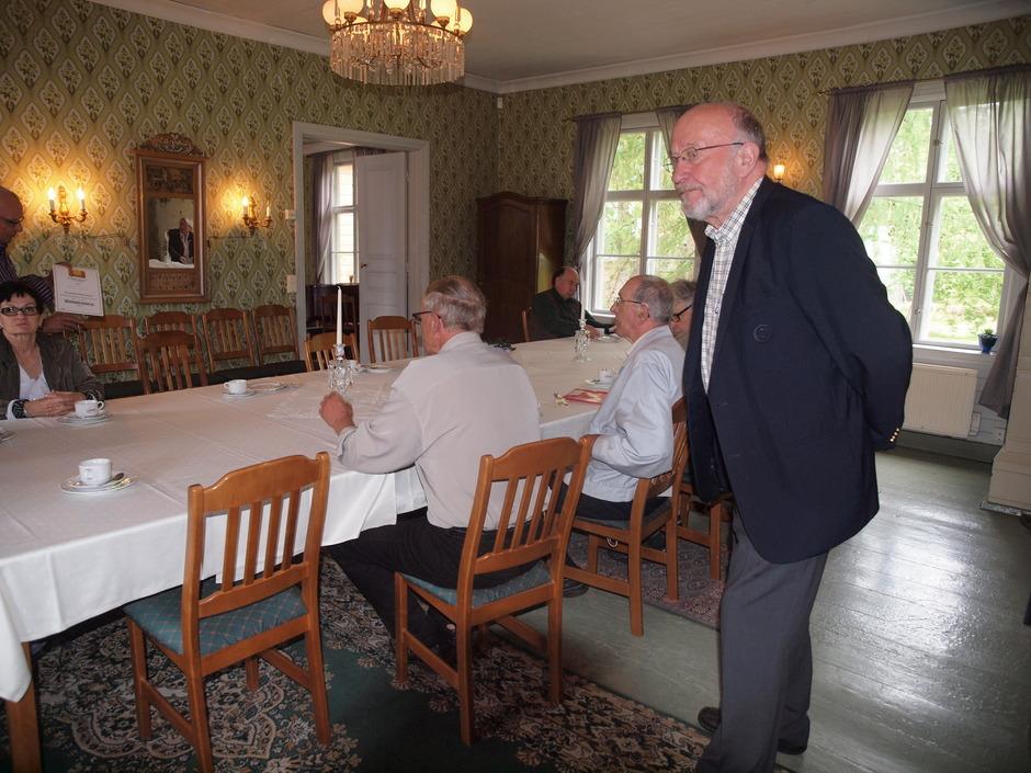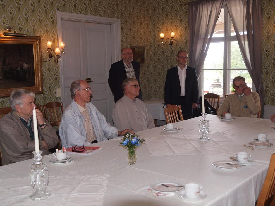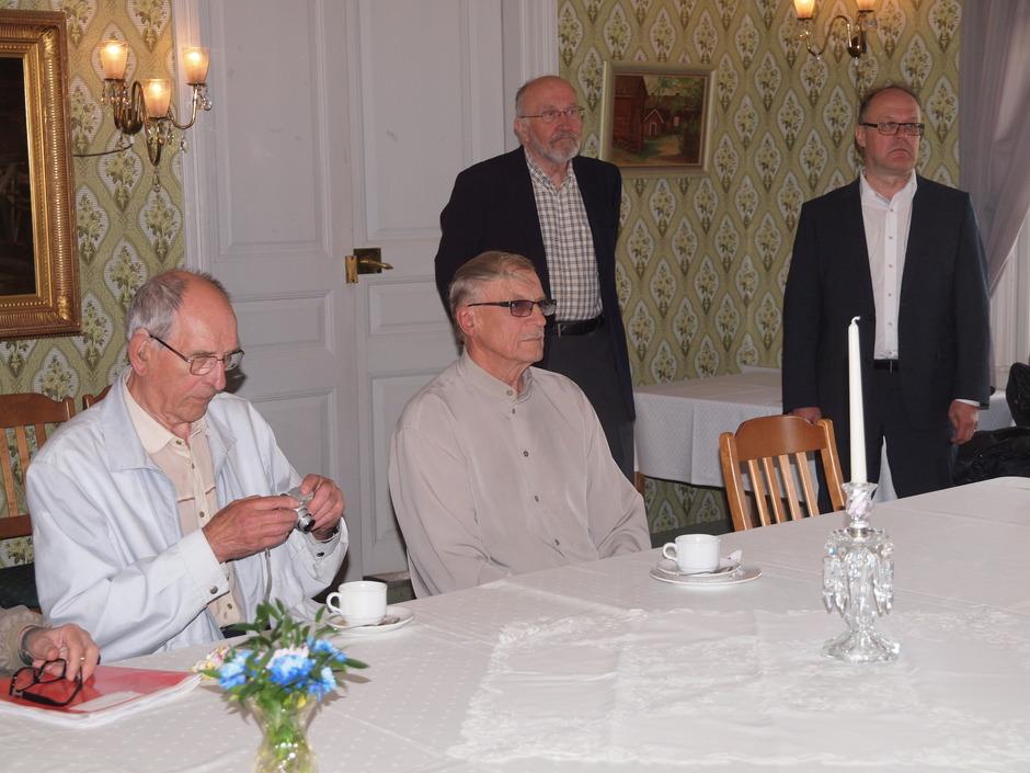 Juhlakahvit juotiin Maikkulan kartanossa, kuvassa vasemmalta Sakari Pesämaa, Paavo Pyrrö, Pirjo Karhu ja Erkki Suvanto.