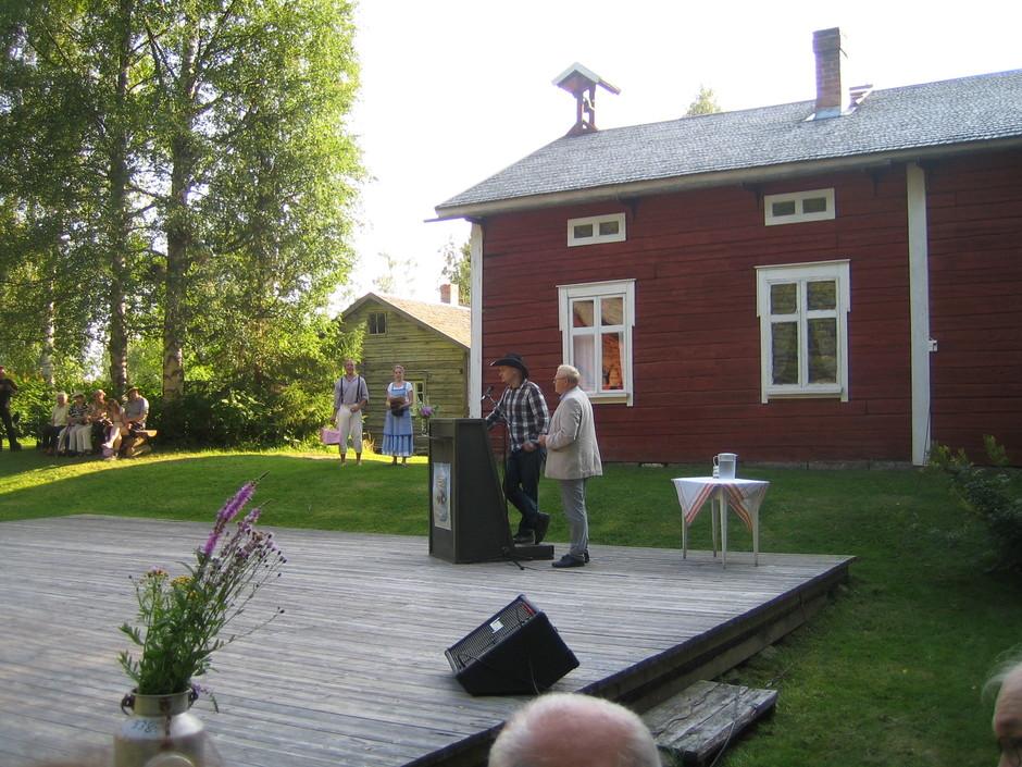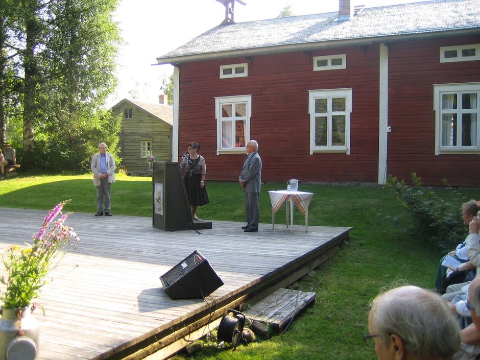 Juhlassa pitkäaikainen puheenjohtaja ja monitoimimies Erkki Suvanto palkittiin Kotiseutuliiton kultaisella ansiomerkillä. Merkkiä luovuttamassa varapj. Pirjo Karhu ja pj. Jouko Arvola