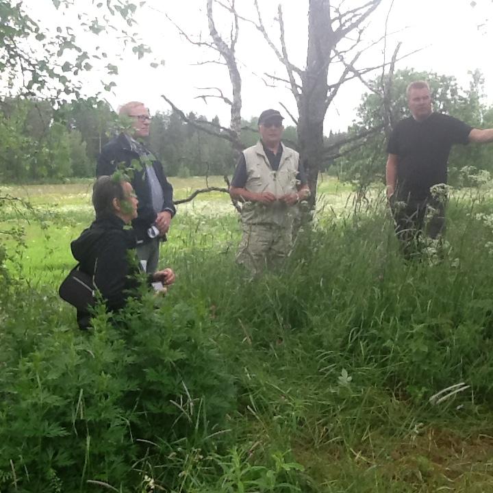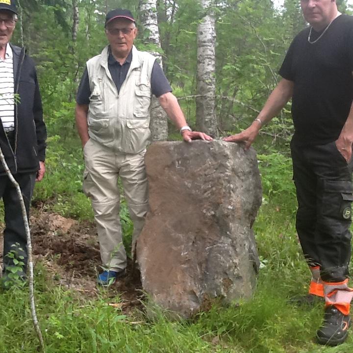 Johtokunnan jäsenistä Sakari Pesämaa ja Erkki Suvanto sekä maapohjan nykyinen omistaja Jaska Holtinkoski Sanginjoen Sorvossa Turkansaareen lahjoitetun savupirtin paikalle asennettavan kunnialaattakiven valinnassa 21.6.2016.