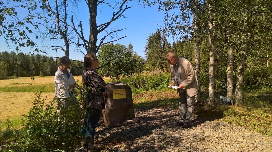 Muistokiven paljastivat puheenjohtaja Jouko Arvola, Turkansaaren edustajana Kaija Niemitalo ja savupirtin lahjoituksessa mukana ollut Pirkko Sorvari