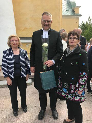 Pirjo Karhu ja Kaija Melamies olivat Oulujoki-seuran puolesta onnittelemassa Heikki Pesämaata papiksi vihkimisjuhlassa 10.6.2018.