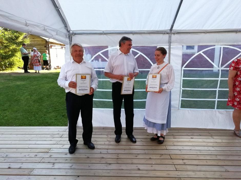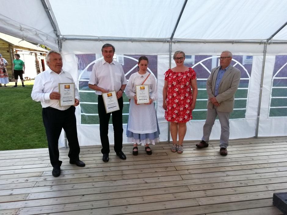Tervaneuvokset vasemmalta Paavo Vasala, Jorma Yypänaho ja Kaija Niemitalon puolesta Salla Mäntyniemi (Kaija ei päässyt itse paikalle, joten hänen puolestaan palkinnon vastaan ottaa Turkansaaren Salla Mäntyniemi)).