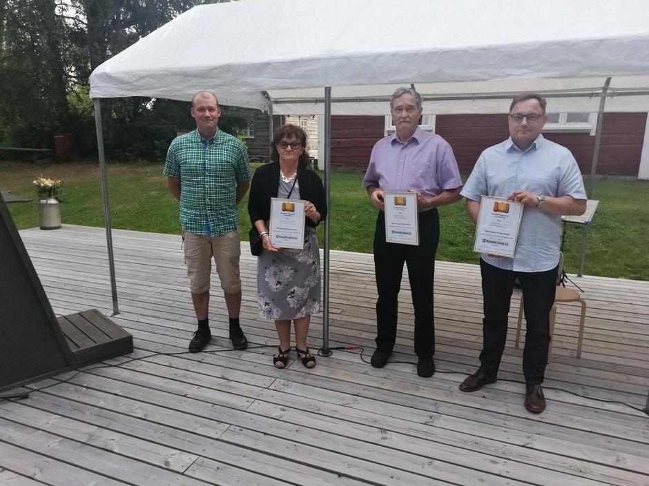 Yhdistyksen puheenjohtaja Antti Ruuttunen ja uudet tervaneuvokset Kotiseutuaktiivi Pirjo Karhu, Rehtori Pentti Kuukasjärvi ja Fermion Oulun tehtaiden edustajana Tehtaanjohtaja Jouko Oikarinen