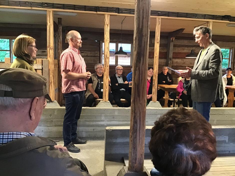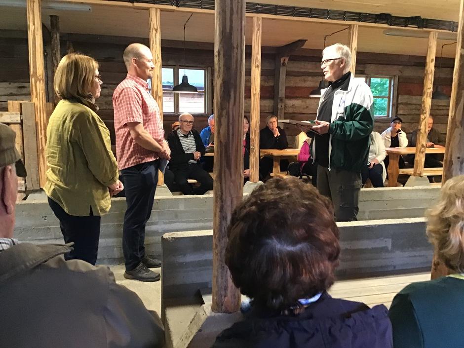 Sihteeri Marja Kynkäänniemi ja puheenjohtaja Antti Ruuttunen ojentavat Raimo Kinnuselle Tervaneuvos-kunniakirjan