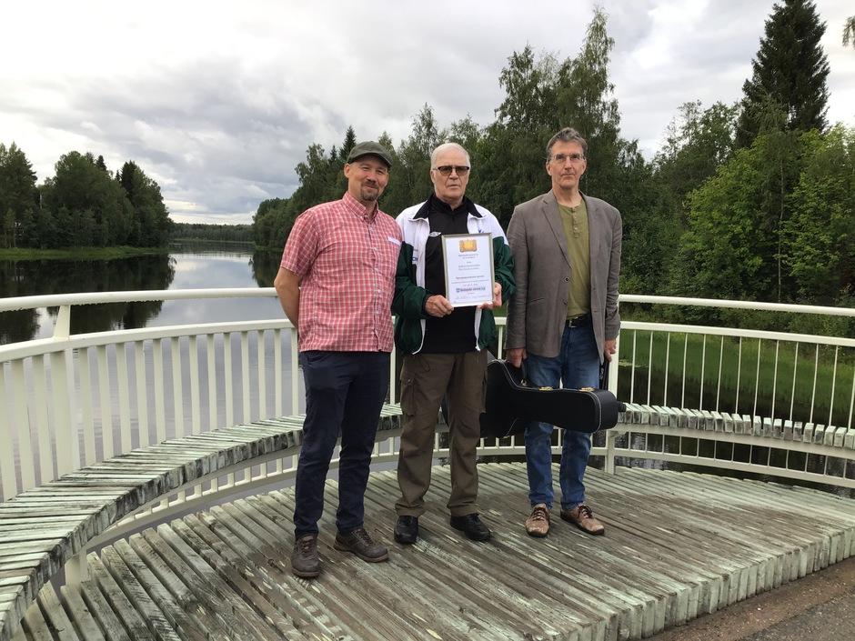 Sihteeri Marja Kynkäänniemi ja puheenjohtaja Antti Ruuttunen ojentavat Mikko Koskelalle Tervaneuvos-kunniakirjan