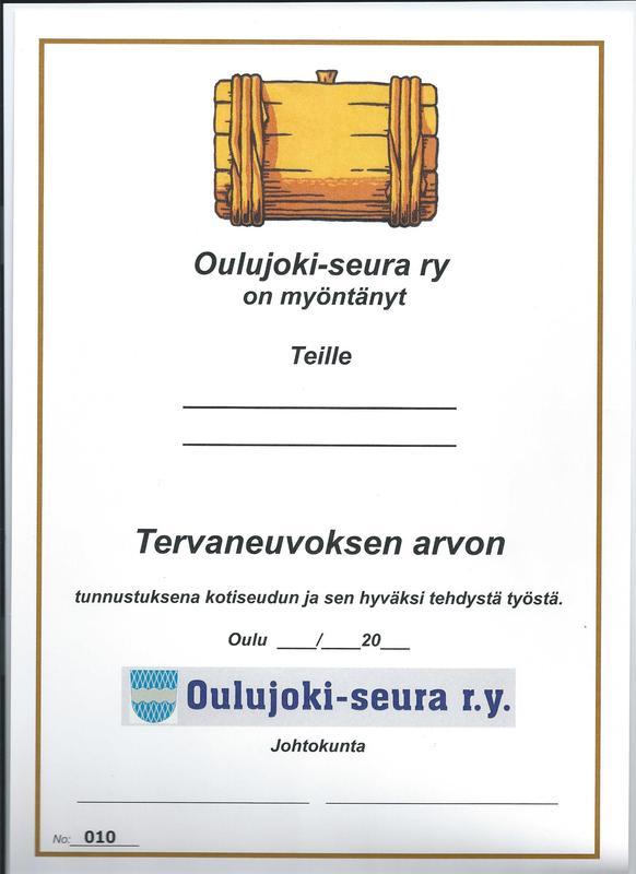 Oulujoki-seura myöntää kotiseututyössä ansioituneille henkilöille tai yhteisöille tervaneuvoksen arvonimiä vuosittain. Kyseisen arvonimen saaneille luovutetaan Jaakonpäiväjuhlassa kunniakirja.